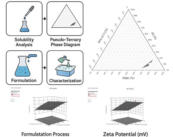 Background: Drugs like Amphotericin B and Luliconazole, which are poorly soluble in water and undergo significant first-pass metabolism, often show low bioavailability. Using nanoemulsion-based delivery systems can enhance absorption and efficacy in the treatment of fungal infections. This study aimed to develop and optimize nanoemulsion formulations of Amphotericin B and Luliconazole to improve their solubility and stability and to demonstrate potential for enhanced bioavailability. Methods: Preliminary characterization of Amphotericin B and Luliconazole included solubility analysis in various solvents, melting point determination, particle size, zeta potential, FTIR spectroscopy, DSC, and XRD. Amphotericin B was further evaluated using a validated RP-HPLC method and subjected to forced degradation studies. Pseudo-ternary phase diagrams were constructed to identify suitable Smix ratios for nanoemulsion formation. Formulations were prepared by homogenization and optimized using a central composite design. Key variables included globule size, zeta potential, homogenization speed, and time. Results and Discussion: The optimized Amphotericin B nanoemulsion (NE-02-8) exhibited a globule size of 168.2 nm, zeta potential of –28.9 mV, PDI of 0.578, drug content of 99.28%, and 99.48% transmittance. Statistical optimization using a Central Composite Design (CCD) confirmed that homogenization speed and time significantly influenced globule size (p < 0.05) and zeta potential (p < 0.05). In contrast, the Luliconazole nanoemulsion showed a globule size of 327.5 nm and a zeta potential of –27.9 mV. Conclusion: Nanoemulsion formulations of Amphotericin B and Luliconazole demonstrated enhanced solubility, stability, and physicochemical properties, indicating their potential to improve drug solubilization and stability relative to conventional formulations.